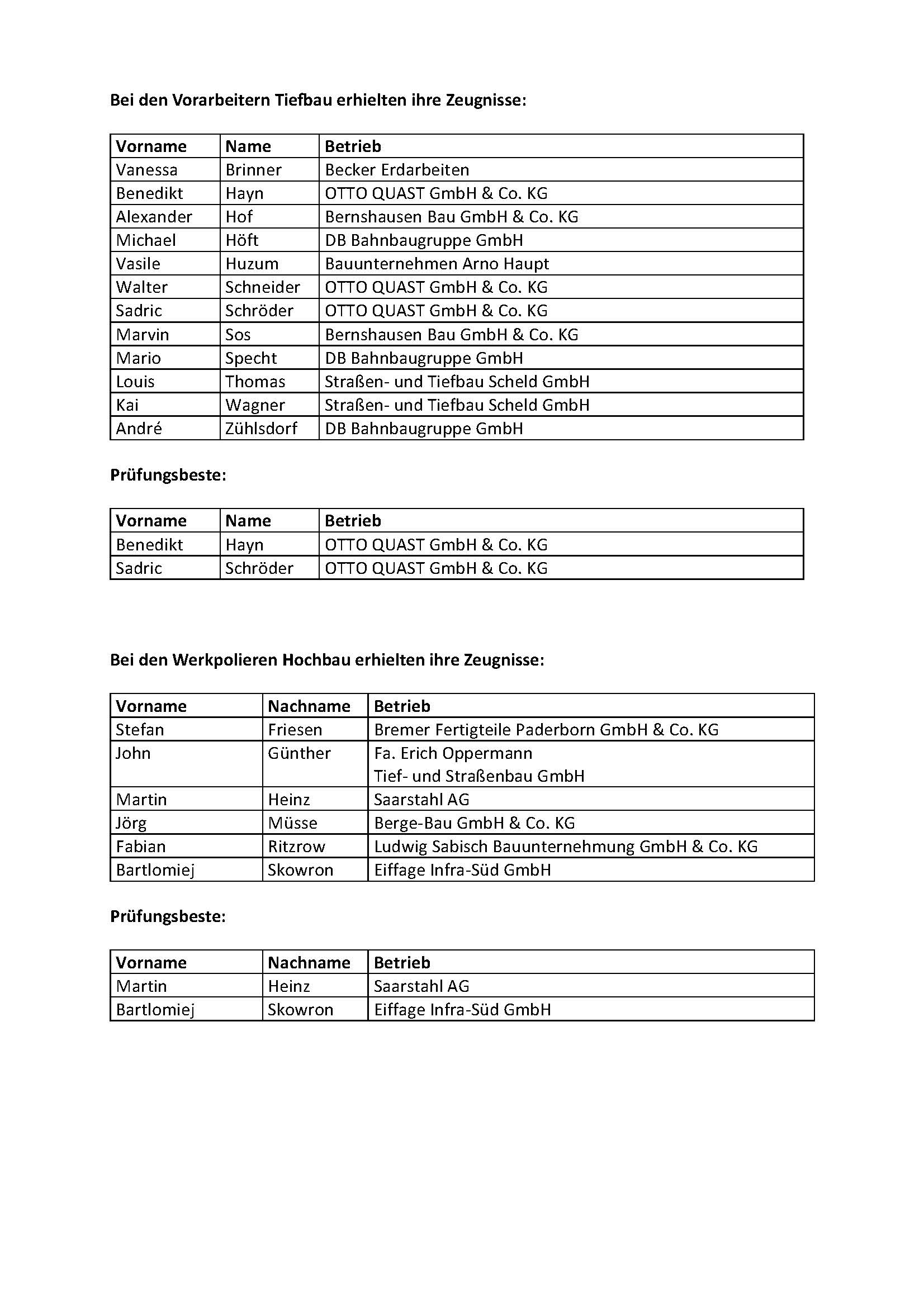 Im Rahmen einer feierlichen Zeugnisübergabe erhielten 56 Teilnehmende der Weiterbildungslehrgänge Betonfertigteilexperte, Vorarbeiter sowie Werkpolier im Hoch- und Tiefbau kürzlich im AWZ Bau in Kreuztal-Fellinghausen ihre Zeugnisse und Urkunden.